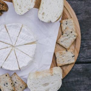 Take the brie cheese, slightly cut it, and place it on a tray with a baking sheet. Put the brown sugar on top of the cheese, and pour 1/4 cup of rum over it.