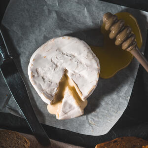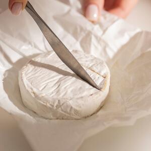 Make small vertical cuts on the brie cheese. Bake the brie wheel for about 10 minutes on a tray lined with parchment paper.