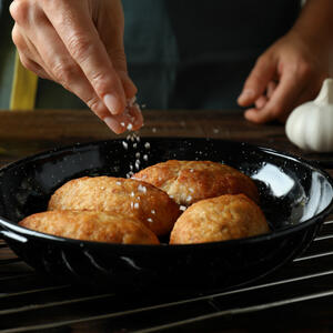 Roll the cutlets in breadcrumbs and give them a flattened shape. Heat the remaining vegetable oil in a clean frying pan, then add the cutlets and cook for 5 minutes on each side over low heat.