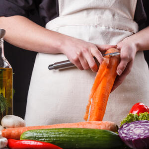 Peel the carrot and dice it into small cubes. Do the same with the apple.