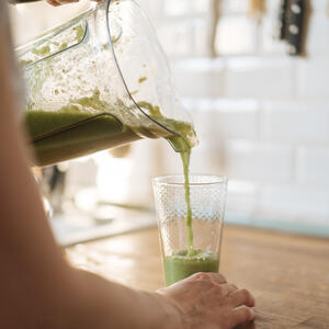 After everything is nicely blended, pour the smoothie into a glass and decorate it to your liking. An idea would be to sprinkle some matcha powder on top of the smoothie; it will look impressive.