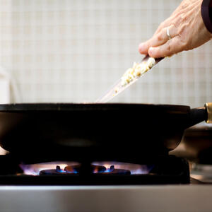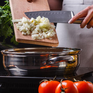And now let's start frying. Fry the onions, carrots and parsnips in a heated pan. This usually takes about 10 min. Pay attention to the onion. It should become soft.