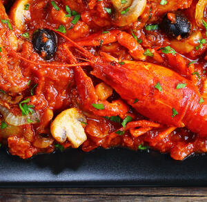 Pour boiling water over the lemon and finely chop along with the peel. Heat oven to 400°F. Put the milk-soaked crayfish in a heat-resistant mold, pour garlic oil, put a finely chopped lemon on top, pour over the sauce and sprinkle chopped parsley and chopped olive rings on top. Bake in the oven for 25-40 minutes. Crayfish should acquire a red tint. Take the dish out of the oven and let it cool. Serve the crayfish topped with additional tomato sauce. Serve with spaghetti, rice or mashed potatoes as a side dish, also drizzling with sauce. This dish goes well with a dry white wine as well.