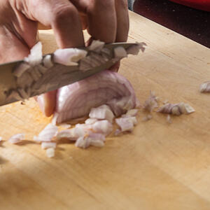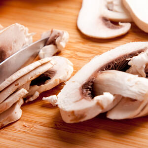 In a deep frying pan, add a little vegetable oil, that has not been refined. Peel and chop the garlic cloves as finely as possible, mix with salt and red pepper, add garlic with salt and pepper to the pan and fry for 2 minutes, stirring quickly. Then add some chopped mushrooms and peeled and diced onion, fry until golden brown. Pour in the tomato juice, cover the pan with a lid and simmer for 7-10 minutes on a low heat. Make sure that the food does not burn to the pan's bottom.
