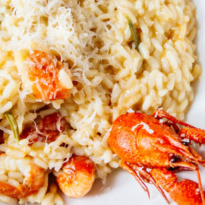 Now add the broth, that remained after cooking the crawfish. Bring to a boil and cook over low heat. After 25 minutes, add garlic chopped into thin slices to the pilaf. Cover with a lid and let the dish simmer for another 15 minutes. When the pilaf is almost ready, there will be literally a couple of minutes left and quite a bit of liquid, add a little grated cheese. Mix everything until smooth. Cover the pot with a lid and let it stay for 15-20 minutes. Pilaf is ready to serve. You can leave a few crawfish unpeeled from the shell and add them cooked as a side dish. Enjoy your meal!