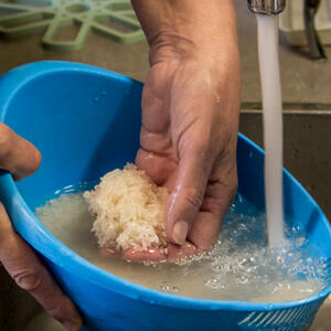 Wash, peel with a knife and grate the carrots on a fine grater. Also wash, peel and finely chop the onion or, like the carrots, grate on a fine grater, cut the celery into small pieces. Brush a frying pan with olive or vegetable oil and fry the onions and carrots until golden brown. Then add rice. Rinse it (to rinse the rice, place it in a small bowl and cover with running water, rinse and drain the dirty water. Do the same a few more times until water becomes more or less transparent.) Fry the rice in a pan until golden-brown, stirring constantly so it doesn't stick to the bottom of the pan.