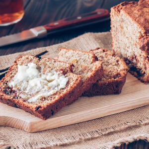 Put the dough into a pre-greased with butter mold and bake the bread for about 1 hour in the oven at 350 °F. Pierce the bread with a spatula to make sure that the dough is not sticky and that the bread is cooked from the inside. Take it out and let it cool slightly. Remove the bread from the mold and cut it into slices. Enjoy this delicate nut-and-fruit bread with a cup of tea or coffee.