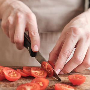 While the barley is cooking, chop the rest of the ingredients: cherry tomatoes, shallot, bell pepper, dill, and mint leaves. In addition, mince the garlic cloves. Place all the cut ingredients into a large mixing bowl.