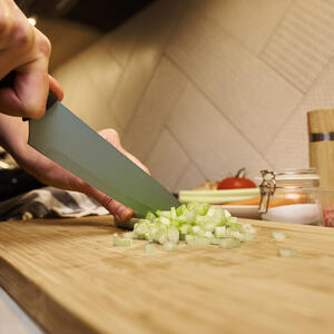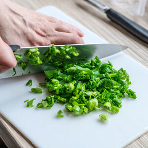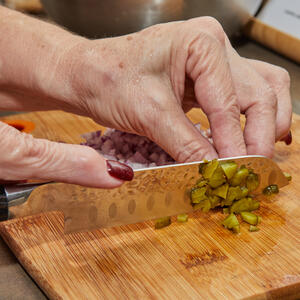 Chop the scallions, celery and the pickles. When cutting a scallion, chop the green part rather than the onion itself.