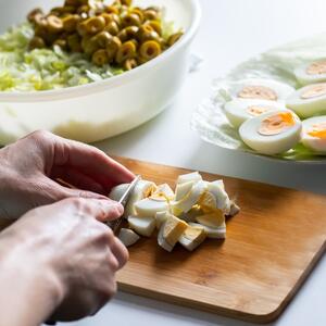 Now, it is time to boil the eggs. Place all six in a medium saucepan. Put the pan on the stove and bring the eggs to a boil. Let them cook for about 10 minutes. Remove them from the heat and let them cool. After that, peel off their skin and chop into thin slices.