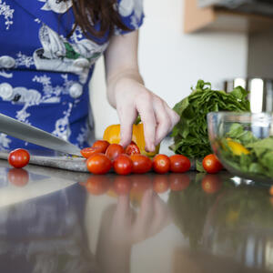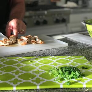 The following ingredients have to be cut into thin slices: cherry tomatoes, scallions, and the chicken breast. Moreover, a super important step is to grate the parmesan. Take a grater and carefully shred the cheese. Put all those ingredients into a large mixing bowl.