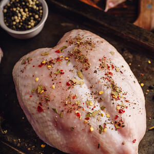 The next step is preparing the chicken breast. Pre-heat the oven to 425° F. Cover the tray with a baking sheet. Season the chicken with a pinch of black pepper and 1 teaspoon of cumin, then pour 1 tablespoon of olive oil on top of it. Roast for 15–18 minutes, until the chicken is cooked through.
