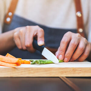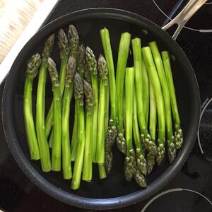 In a medium pot, pour 2 glasses of water and add 1 teaspoon of salt. Bring it to a boil, and then add the 3.5 ounces of asparagus. Cook uncovered until tender, for about 4 minutes. After it is prepared, drain the excess water and let it cool for an additional 15 minutes. When the time has passed, chop the asparagus.