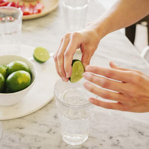 Cut your lime in half; each half should be squeezed until juice pours out of it. While doing this, take a glass and place it under the lime, so the juice falls into it.