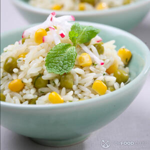 After the rice is fully cooked, place the meal into a large dish and serve it with 1 teaspoon of canned corn and mint leaves.