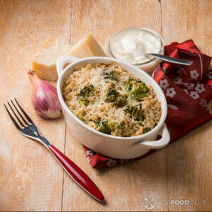 When everything is cooked and chopped, place all the ingredients in a large bowl. Mix together the rice, butter, minced garlic, bell pepper, broccoli, and grated parmesan. Incorporate the dish thoroughly until well combined.