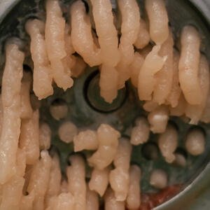When the crawfish turn bright red, it means they are ready. Remove just the crawfish with a spoon or ladle and peel off the shell and the small intestine in the tail. After that, put the claws, shell and crayfish meat into a blender and grind to a pulpy mass.