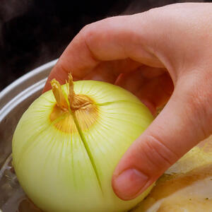 Take 1 large onion, rinse and peel it. Now, a few options: if you like the taste of cooked onions, then you can slice them in rings, half rings, cubes or grate them on a fine grater. If you only add onions for the broth, then don't cut the onion, add it while the broth is cooking and then take it out.