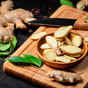 Add finely chopped ginger, lime leaves, and lemongrass (two tablespoons dry or two stalks fresh) to the chicken broth and cook for five minutes.