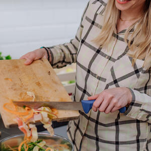 Wash, peel and dice the onion, carrots and celery. Put them into a large pre-greased saucepan with olive oil. Fry all on low heat until the vegetables are soft.