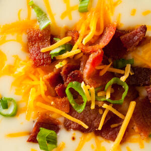 Puree the potatoes with in a blender, pour the soup into a bowl, top with crispy bacon, grated cheese and herbs to your taste.