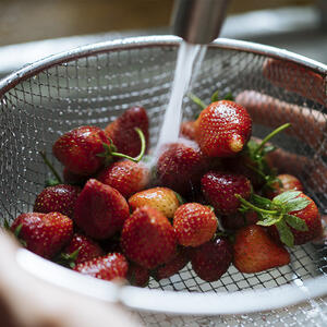 Клубнику промойте под водой, а затем удалите веточки с листочками.