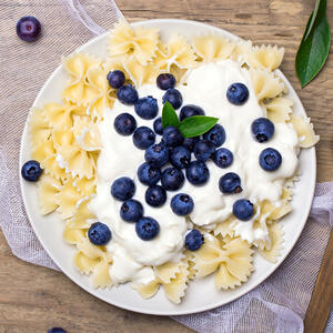 Теперь заправьте макароны сметанным соусом и добавьте голубику. Блюдо подавайте к столу сразу, пока оно ещё тёплое. Приятного аппетита!