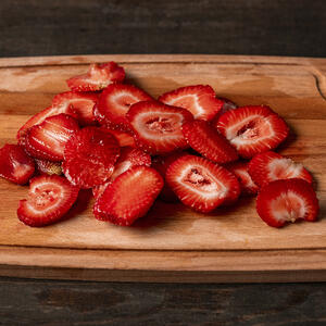 Клубнику помойте и обсушите с помощью бумажного полотенца. Удалите веточки и нарежьте её на плоские ломтики.