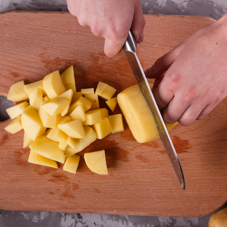 Картофель промойте, тщательно очистите от кожуры и нарежьте кубиками размером примерно 2x2 см.