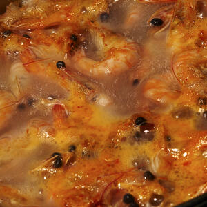 В отдельной маленькой кастрюле доведите воду до кипения, посолите. Аккуратно добавьте креветки в кипящую воду. Как только вода вновь закипит и креветки начнут всплывать на поверхность, немедленно снимите кастрюлю с огня. Слейте воду и оставьте креветки остывать. После остывания очистите их от голов и панциря.