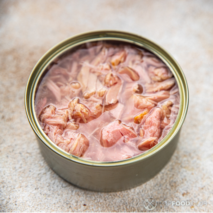 Моем помидоры и руколу. Помидоры нарезаем дольками. Открываем банку с консервированным тунцом. Если тунец в собственном соку — сливаем жидкость с банки, а если в масле — оставляем. Разминаем рыбу вилкой на кусочки.