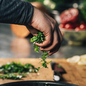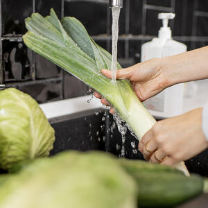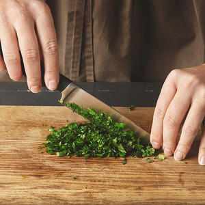 Помойте и измельчите петрушку. Также тщательно промойте лук-порей и нарежьте его колечками.