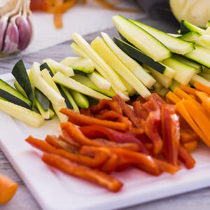 Помойте кабачок и баклажан. Нарежьте их на брусочки.