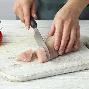 Вымойте и обсушите куриное филе, затем нарежьте на кусочки среднего размера.
