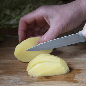 Картофель помойте, очистите и нарежьте небольшими куосчками в виде долек.